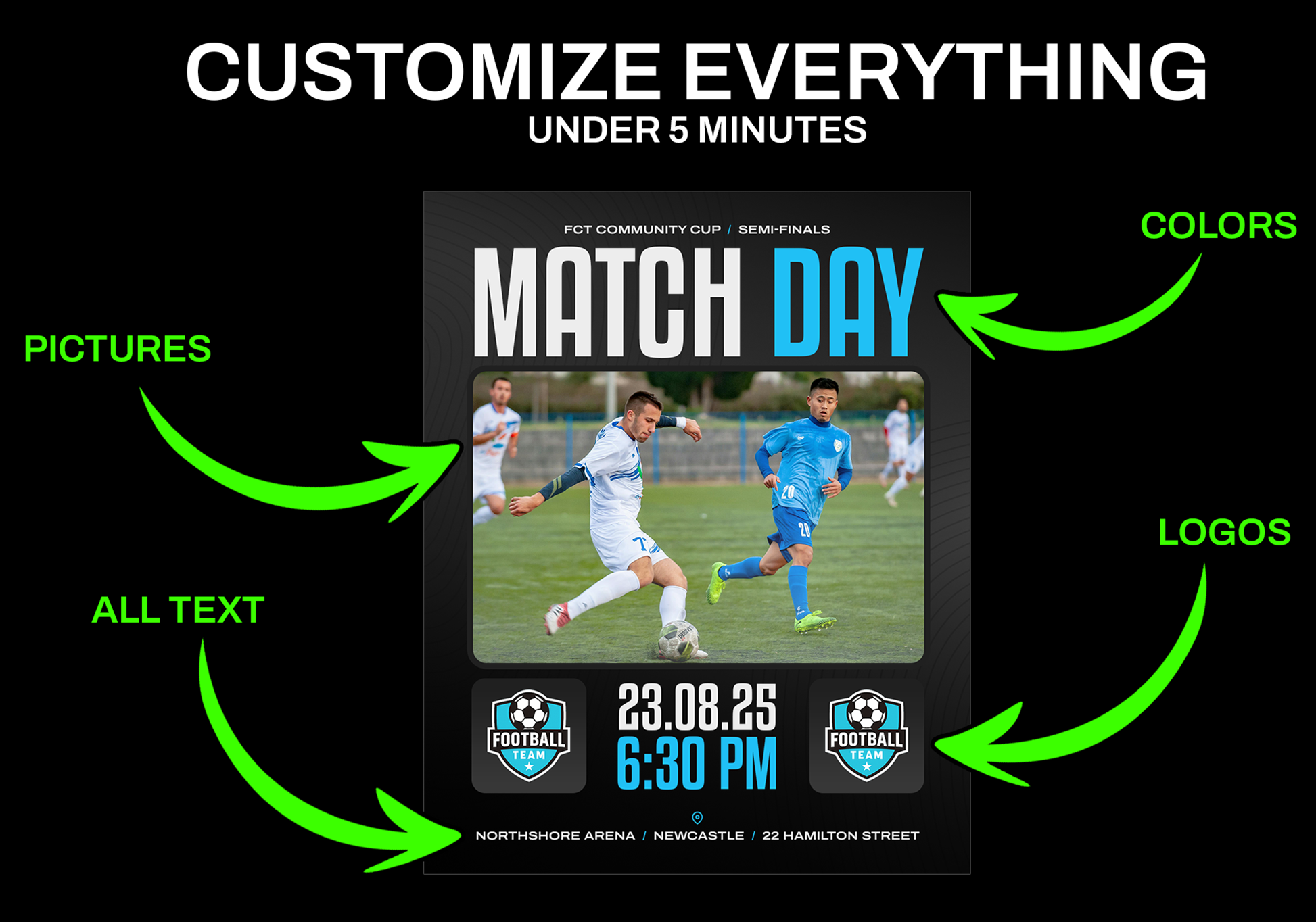 Quickly personalize with your team’s colors, text, logos, and photos. Each graphic takes less than 5 minutes to customize!